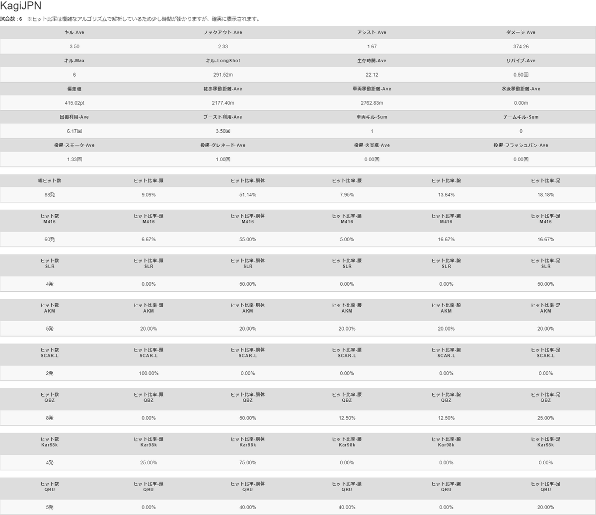 よくあるキル・アシストやダメージに加え、どんな移動手段でどのくらいの距離を移動したか、どの武器でどの部位に対してどれくらいヒットしたかなど確認できます!
